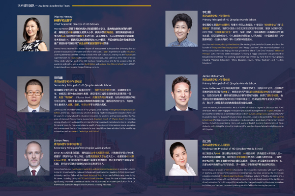 青岛西海岸新区万达赫德双语学校拥有一支教学经验丰富、 教学能力突出的中外教团队。每位老师都对教育抱有极大的热情,认同学校的教育理念,致力于 为学生提供一个舒适而有序的教学环境 管理团队拥有多年的双语学校和国际学校教学管理经验。
