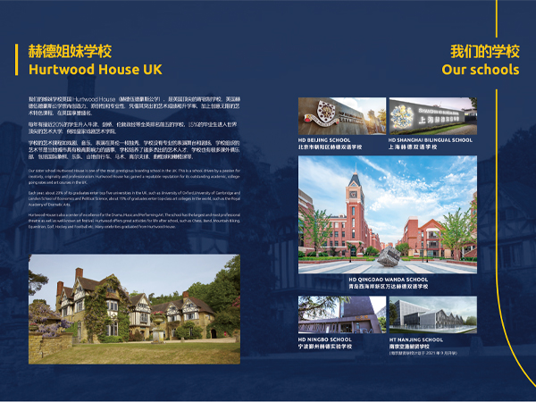 青岛赫德双语学校的姊妹学校英国Hurtwood House (赫德伍德豪斯公学) ,是英国的寄宿制学校。英国赫德伍德豪斯公学崇尚创造力、原创性和专业性,凭借其突出的艺术成绩和,加上创意无限的艺术特色课程,在英国享誉盛名。